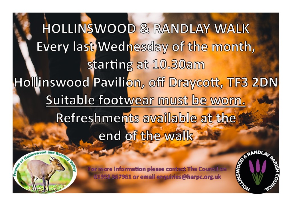 We will be meeting at Hollinswood Pavilion (TF3 2DN) at 10 am and the walk will be approximately 60 minutes long – light refreshments will be available when we return.